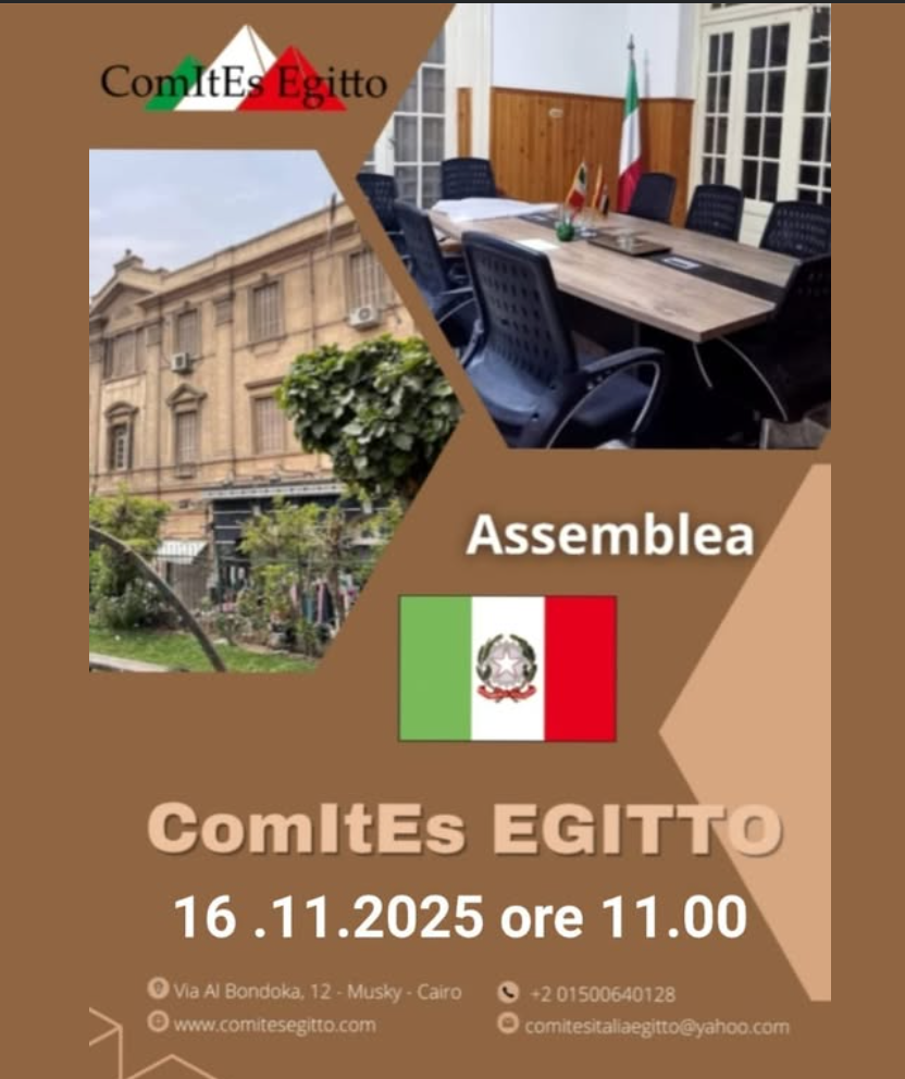 Dopo le consuete attese e la totale assenza di comunicazioni tempestive, e dopo svariati solleciti, il COMITES d’Egitto ha finalmente convocato la prossima assemblea, che si terrà sabato 16 novembre 2025 alle ore 11:00, presso la sede del...